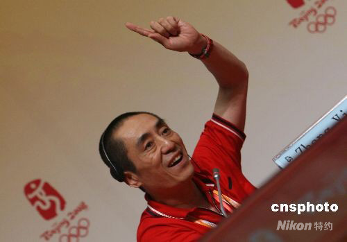8月9日凌晨,北京奧運會開幕式創(chuàng)作團隊在北京奧林匹克公園主新聞中心就開幕式等相關(guān)問題答記者問。圖為總導(dǎo)演張藝謀笑答記者提問。 中新社發(fā) 武仲林 攝