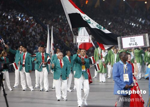 8月8日,第29屆夏季奧運(yùn)會在北京奧林匹克公園內(nèi)的國家體育場“鳥巢”開幕。圖為伊拉克代表團(tuán)入場。8月4日,伊拉克代表團(tuán)一行11人經(jīng)科威特后再由迪拜轉(zhuǎn)機(jī)搭乘阿聯(lián)酋航空公司航班順利抵達(dá)北京。