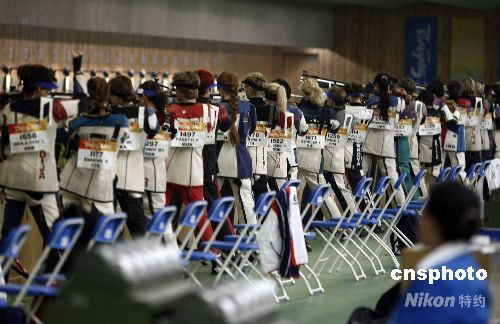 8月9日,北京奧運(yùn)會(huì)開賽的第一天,女子10米氣步槍資格賽率先在北京射擊館拉開戰(zhàn)幕。30多個(gè)國(guó)家的47名選手在17到63號(hào)靶位比試槍法,資格賽前8名進(jìn)入最后決賽。按照賽程,女子氣步槍賽場(chǎng)極可能產(chǎn)生本屆奧運(yùn)會(huì)的首枚金牌。圖為來自各國(guó)的女神槍手參加預(yù)賽。中新社發(fā) 盛佳鵬 攝