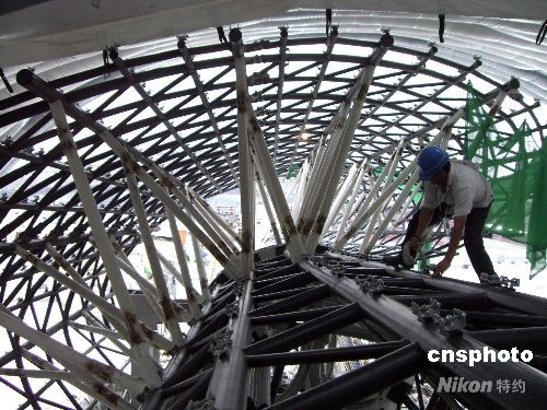 圖為氣房子建造好以后,火炬第一次開進(jìn)氣房子,工人進(jìn)入火炬內(nèi)部檢查。中新社發(fā) 佟偉 攝