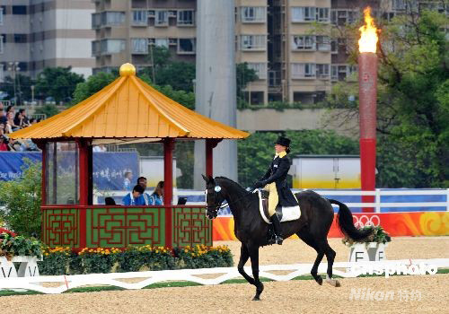 八月九日上午,北京奧運(yùn)馬術(shù)比賽項(xiàng)目在香港沙田賽場(chǎng)舉行首場(chǎng)比賽。馬術(shù)比賽的三項(xiàng)賽之盛裝舞步個(gè)人賽在第一個(gè)比賽日展開。中新社發(fā) 洪少葵 攝