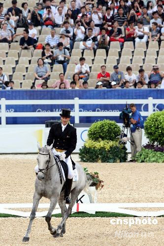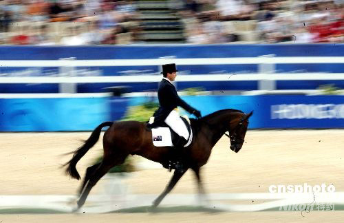 圖為首名登場的新西蘭選手圖·馬克(Todd Mark)在三項(xiàng)賽第一回合盛裝舞步賽中。中新社發(fā) 洪少葵 攝