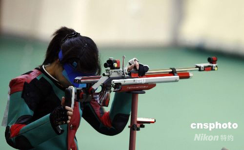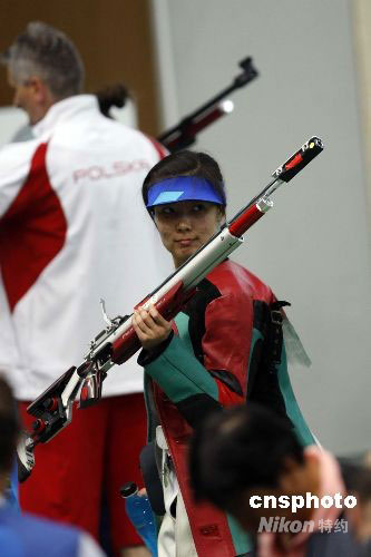 8月9日,北京奧運(yùn)會(huì)開賽的第一天,女子10米氣步槍決賽在北京射擊館進(jìn)行。中國(guó)選手杜麗無(wú)緣金牌,捷克選手卡特日娜·埃蒙斯獲得首枚金牌,同時(shí)也是北京奧運(yùn)會(huì)產(chǎn)生的首枚金牌。中新社發(fā) 盛佳鵬 攝