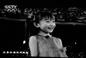 “五星紅旗迎風(fēng)飄揚(yáng),勝利歌聲多么響亮……”清澈的童音響徹“鳥巢”上空,昨晚8時(shí)6分,北京奧運(yùn)會(huì)開幕式升旗儀式前,一名身著紅色紗裙的女孩出現(xiàn)在電視畫面中,她緊攥拳頭,領(lǐng)唱《歌唱祖國(guó)》,隨后,代表56個(gè)民族的少年起舞、五星紅旗升起。