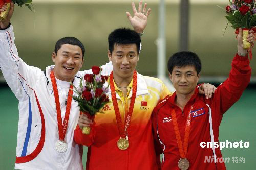 8月9日,北京奧運(yùn)會(huì)射擊比賽男子10米氣手槍決賽在北京射擊館結(jié)束,中國隊(duì)22歲河北小將龐偉(中)獲得冠軍,韓國隊(duì)的榮國(JIN Jongoh)(左)和朝鮮隊(duì)的金榮洙(KIM Jong Su)(右)分獲銀牌和銅牌。中新社發(fā) 盛佳鵬 攝