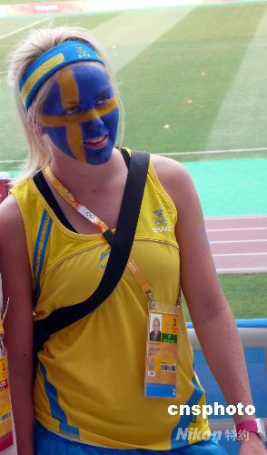8月9日,首戰(zhàn)失利的瑞典女足在天津?qū)⒂瓉淼诙䝼(gè)對手阿根廷隊(duì)。比賽前,“全副武裝”的瑞典女球迷早早來到球場為球隊(duì)加油。中新社發(fā) 鄧霞 攝