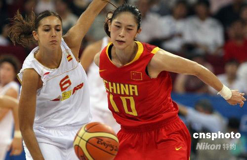 8月9日下午,中國(guó)女籃在北京奧運(yùn)會(huì)籃球館--五棵松體育館舉行的小組賽首場(chǎng)比賽中,以67比64險(xiǎn)勝擊敗西班牙隊(duì)。圖為中國(guó)隊(duì)頭號(hào)美女隋菲菲與西班牙隊(duì)6號(hào)美女ABALDE Tamara在場(chǎng)上“比美”。中新社發(fā) 任晨鳴 攝