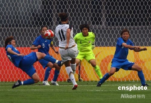 上半場美國隊(duì)11號卡莉·勞埃德首先攻克日本隊(duì)大門。