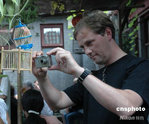 圖為奧地利游客8月9日下午游覽北京胡同的四合院時(shí),對(duì)主人掛在院中竹籠里的蟈蟈蟲(chóng)深感好奇。中新社發(fā) 王辛莉 攝