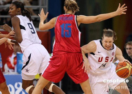 8月9日晚,雅典奧運(yùn)會(huì)冠軍美國女籃在北京奧運(yùn)會(huì)籃球館——五棵松體育館開始衛(wèi)冕之旅,首場(chǎng)比賽以97比57擊敗捷克隊(duì)。圖為美國隊(duì)超級(jí)球星9號(hào)萊斯麗,利用檔拆戰(zhàn)術(shù)協(xié)助14號(hào)后衛(wèi)史密斯突破捷克隊(duì)防線。 中新社發(fā) 任晨鳴 攝