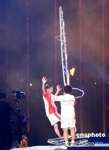 第29屆奧林匹運(yùn)動(dòng)會(huì)帆船比賽啟動(dòng)儀式8月9日晚在青島舉行,曾經(jīng)獲得1992年巴塞羅那奧運(yùn)帆板女子A390級(jí)亞軍的張小冬手持火炬與香港退役運(yùn)動(dòng)員李麗珊交接火炬。中新社發(fā) 趙振清 攝