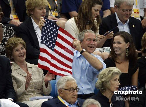 8月10日,美國總統(tǒng)布什、澳大利亞總理陸克文(右上)在“水立方”觀看北京奧運(yùn)會游泳比賽,為“自家”選手加油。中新社發(fā) 杜洋 攝