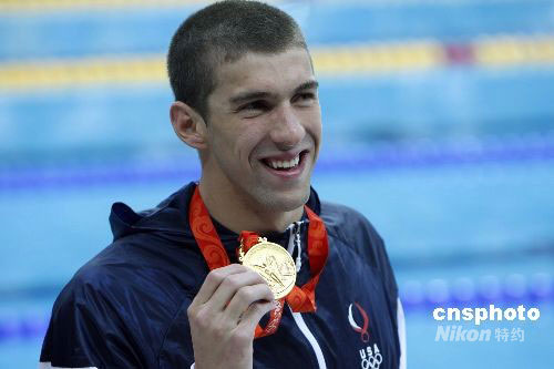 8月10日,美國(guó)選手菲爾普斯獲得北京奧運(yùn)會(huì)男子400米個(gè)人混合泳冠軍,菲爾普斯以4分3秒84打破了他個(gè)人保持的男子400米個(gè)人混合泳世界紀(jì)錄,這是北京奧運(yùn)會(huì)上第一項(xiàng)被刷新的世界紀(jì)錄。中新社發(fā) 杜洋 攝