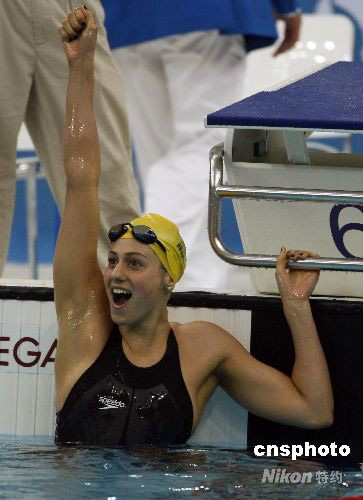 8月10日,北京奧運(yùn)會(huì)女子400米個(gè)人混合泳決賽中,澳大利亞選手賴斯打破世界紀(jì)錄并獲得冠軍。賴斯創(chuàng)造的新世界紀(jì)錄為4分29秒45。原世界紀(jì)錄是美國(guó)選手霍夫在今年6月底創(chuàng)造的4分31秒12。 中新社發(fā) 杜洋 攝