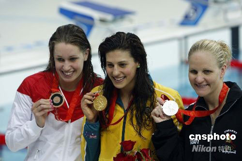 8月10日,北京奧運(yùn)會(huì)女子400米個(gè)人混合泳比賽,澳大利亞20歲選手斯蒂芬妮-賴斯(中)以4分29秒45奪得金牌,并打破世界紀(jì)錄。津巴布韋選手考文垂以4分29秒89獲得銀牌,同時(shí)也打破了世界紀(jì)錄。美國(guó)選手霍夫以4分31秒71獲得銅牌。中新社發(fā) 杜洋 攝