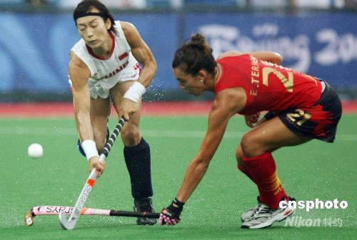 8月10日,中國女曲在北京奧運(yùn)會(huì)女子曲棍球小組賽首場比賽中以3:0戰(zhàn)勝西班牙隊(duì)。圖為雙方球員展開激烈爭奪。中新社發(fā) 武仲林 攝