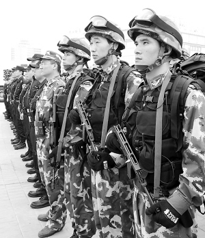 圖為公安特警武警準備在街頭武裝巡邏。 本報記者 張 震 攝
