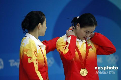 8月10日,素有“夢(mèng)之隊(duì)”之稱的中國(guó)跳水隊(duì)黃金組合郭晶晶和吳敏霞輕松獲得女子雙人三米板金牌。圖為郭晶晶在領(lǐng)獎(jiǎng)臺(tái)上幫吳敏霞整理衣領(lǐng)。中新社發(fā) 杜洋 攝