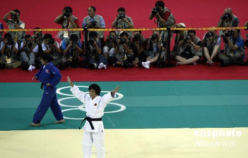 8月10日晚,奧運會衛(wèi)冕冠軍、33歲的中國名將冼東妹在2008年北京奧運會柔道女子52公斤級決賽中,繼續(xù)出色表現(xiàn),非常輕松的戰(zhàn)勝朝鮮選手安琴愛,成功衛(wèi)冕該項目冠軍。中新社發(fā) 盛佳鵬 攝