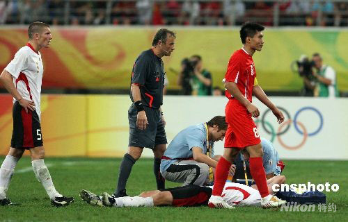 北京時(shí)間8月10日晚,奧運(yùn)男足賽第二輪打響。中國國奧隊(duì)在沈陽迎戰(zhàn)比利時(shí)國奧隊(duì)。經(jīng)過90分鐘的激戰(zhàn),中國國奧隊(duì)0:2不敵對手,比賽中兩名中國國奧隊(duì)員吃到紅牌被罰下場。 中新社發(fā) 張宇 攝