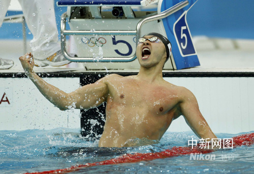 8月11日,在北京奧運(yùn)會(huì)游泳男子100米蛙泳比賽中,日本選手北島康介以58.91秒成績(jī)打破世界紀(jì)錄奪得該項(xiàng)目冠軍。中新社發(fā) 杜洋 攝