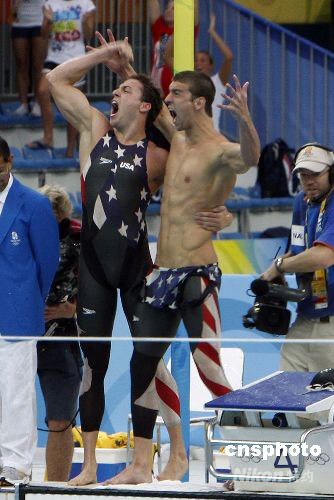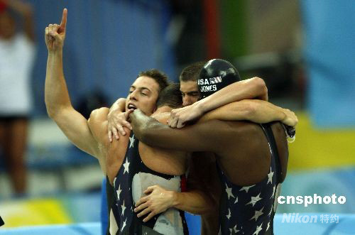 8月11日,美國隊(duì)奪得北京奧運(yùn)會男子4x100米自由泳接力險(xiǎn)勝法國,奪得該項(xiàng)目的金牌,并打破世界紀(jì)錄。 中新社發(fā) 杜洋 攝