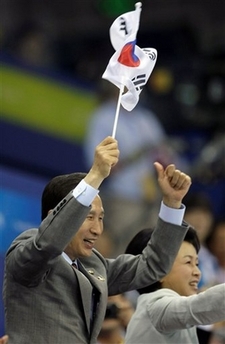 據(jù)韓國《朝鮮日報(bào)》等媒體報(bào)道,9日下午在北京奧林匹克中心舉行的韓國女子手球隊(duì)同俄羅斯隊(duì)的比賽中,李明博上半場進(jìn)行到中間的時(shí)候入場,揮舞韓國國旗為韓國隊(duì)加油。但是,李明博揮舞的韓國國旗的太極圖案和四卦上下顛倒。在總統(tǒng)身旁一起加油助威的金潤玉女士和文化體育觀光部長官柳仁村等人的旗幟則正常。