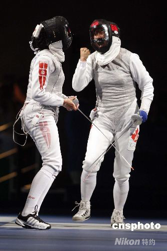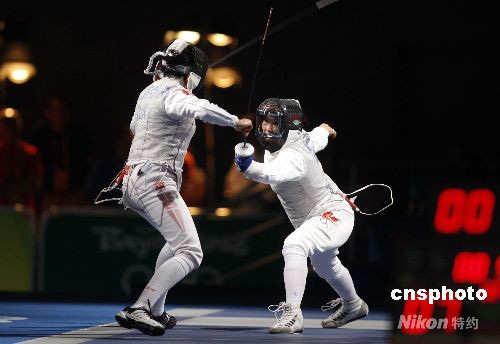 8月11日,北京奧運(yùn)會(huì)女子花劍個(gè)人1/32決賽在北京國(guó)家會(huì)議中心擊劍館舉行,代表加拿大出戰(zhàn)的“擊劍媽媽”欒菊杰(右)以13:9的成績(jī)戰(zhàn)勝突尼斯選手伊娜·布貝克里,成功晉級(jí)。 中新社發(fā) 盛佳鵬 攝