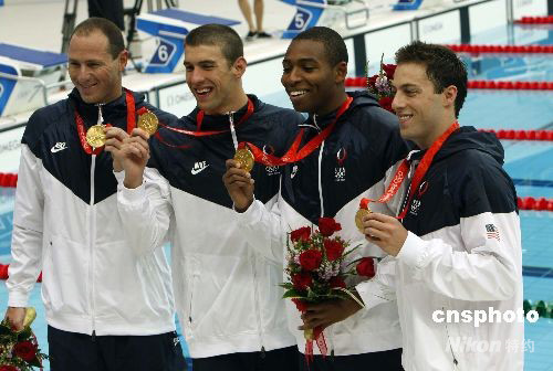 8月11日,美國隊(duì)奪得北京奧運(yùn)會(huì)男子4x100米自由泳接力金牌,并打破該項(xiàng)目世界紀(jì)錄! ≈行律绨l(fā) 杜洋 攝