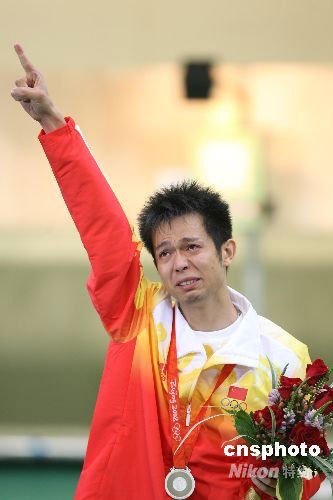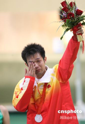 8月11日,中國(guó)選手朱啟南在北京奧運(yùn)會(huì)男子10米氣步槍決賽中以699.7環(huán)的成績(jī)奪得銀牌,印度選手賓德拉奪得冠軍。圖為朱啟南在領(lǐng)獎(jiǎng)臺(tái)上眼泛淚光。中新社發(fā) 武仲林 攝