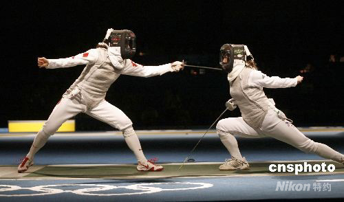 8月11日,北京奧運會女子花劍個人1/16決賽在北京國際會議中心擊劍館舉行,中國選手蘇婉文(左)以15:7戰(zhàn)勝美國選手埃米莉·克羅斯,成功晉級。 中新社發(fā) 盛佳鵬 攝