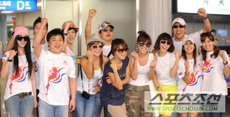 中新網(wǎng)8月11日電 據(jù)韓國《體育朝鮮》報道,8月9日,韓國明星們組團前往北京,為參加北京奧運會的韓國國家隊運動員加油助威。當天,由金容萬、米娜、蔡妍、尹正秀、金娜妍、趙汝貞等藝人組成的明星拉拉隊抵達北京。