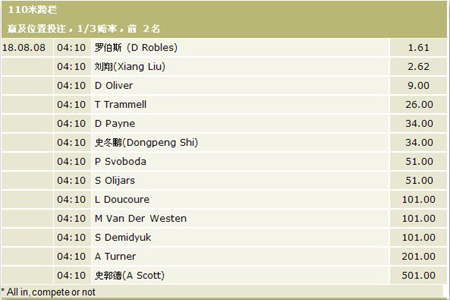 而從單項金牌博彩公司開出的賠率看來,中國軍團在乒乓球、羽毛球和跳水等傳統(tǒng)強勢項目上均位列第一。至于備受關注的男子110米欄,不同博彩公司就有了差異。如易勝博等仍將劉翔排在首位,賠率為1.8左右,但立博等博彩公司則更看好古巴小將羅伯斯,賠率為1.6左右,低于劉翔的2.6。