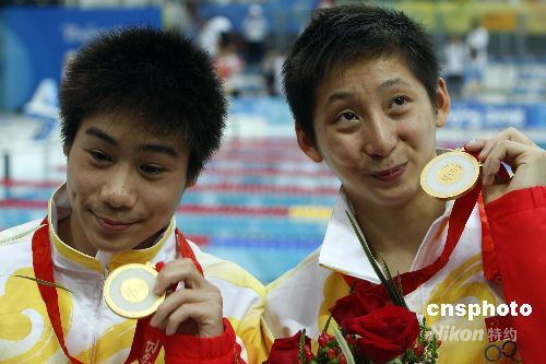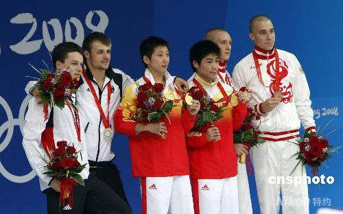 8月11日,中國(guó)“月亮組合”林躍(右)、火亮首次亮相奧運(yùn)大賽,獲得北京奧運(yùn)會(huì)男子10米雙人跳臺(tái)跳水金牌。這是當(dāng)天中國(guó)代表團(tuán)獲得的首枚金牌,也是中國(guó)代表團(tuán)在本屆奧運(yùn)會(huì)上獲得的第七枚金牌。林躍1991年出生,籍貫廣州潮州;鹆脸錾1989年,來(lái)自上海跳水隊(duì)。 中新社發(fā) 杜洋 攝