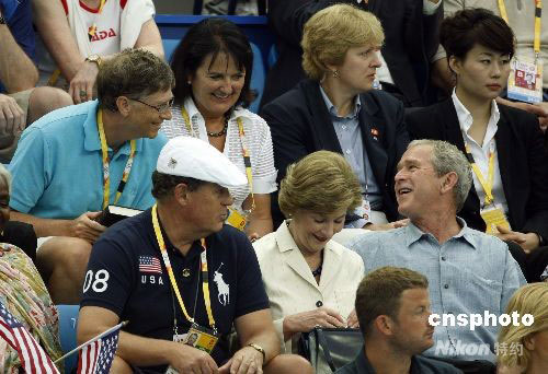 8月11日,美國(guó)總統(tǒng)布什和比爾·蓋茨在“水立方”相遇,一同觀看游泳比賽,為美國(guó)隊(duì)加油助威。中新社發(fā) 杜洋 攝