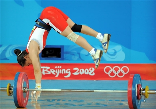8月11日,阿爾巴尼亞選手羅梅拉·貝加伊試舉成功后興奮地翻起筋斗。當(dāng)日,北京奧運(yùn)會(huì)舉重女子58公斤級(jí)決賽在北京航空航天大學(xué)體育館舉行。