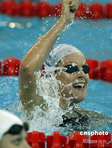 8月11日,在北京奧運會女子200米自由泳預(yù)賽中,意大利選手費代麗卡·佩萊格里尼以1分55秒45,破世界紀錄。中新社發(fā) 杜洋 攝