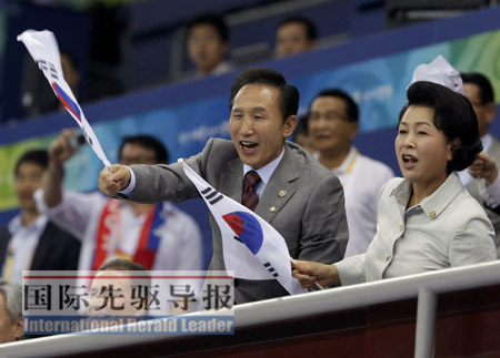 8月9日,李明博夫婦為韓國女子手球隊(duì)加油。