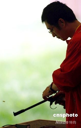 8月12日,北京奧運會男子50米手槍比賽在北京射擊館開戰(zhàn),譚宗亮代表中國射擊隊出戰(zhàn)并殺入決賽。圖為譚宗亮在比賽中。中新社發(fā) 盛佳鵬 攝