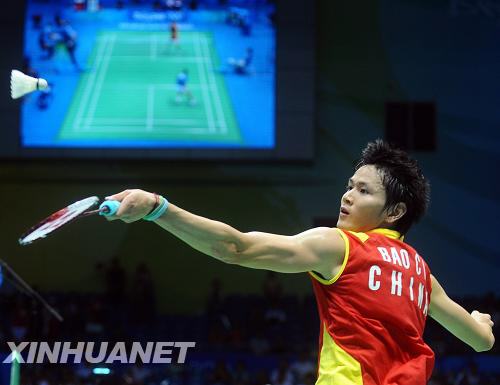 8月12日,在北京奧運(yùn)會(huì)羽毛球男子單打前16名比賽中,中國(guó)選手鮑春來(lái)2比1戰(zhàn)勝波蘭選手普熱梅斯瓦夫·瓦查,晉級(jí)8強(qiáng),三局的比分為21:11,19:21,21:13。新華社記者羅曉光攝