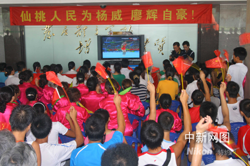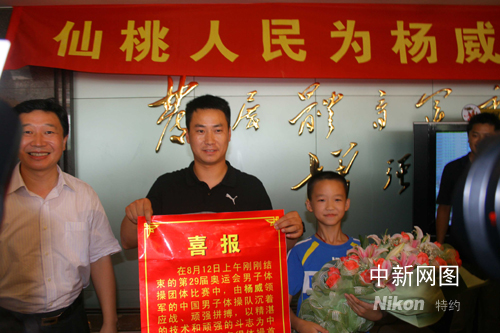 8月12日,楊威率領中國體操男隊奪得奧運會團體金牌。當日中午時分,當消息傳到楊威家鄉(xiāng)中國體操之鄉(xiāng)湖北仙桃市,早早守侯在電視機前的當?shù)毓賳T、民眾一片沸騰,人們敲鑼打鼓、齊鳴鞭炮,熱烈慶賀仙桃籍運動員楊威再次獲得奧運會體操男團冠軍。