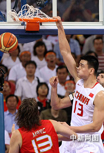 8月12日,北京奧運(yùn)會(huì)男子籃球小組賽第二輪賽事開賽,首戰(zhàn)負(fù)于“夢(mèng)八隊(duì)”的中國男籃在姚明率領(lǐng)下向世錦賽冠軍西班牙隊(duì)發(fā)起猛攻。圖為姚明大力扣籃。中新社記者 任晨鳴 攝