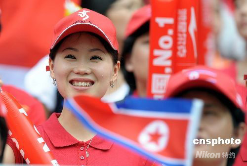 8月12日下午,奧運女足小組賽進行到第三輪,朝鮮女足和德國隊的較量在天津“水滴”體育場進行,亞洲冠軍朝鮮隊和世界冠軍德國之間為出線決一勝負。圖為朝鮮女球迷天津助威。 中新社發(fā) 陳文 攝