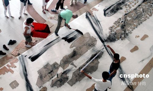圖為蔡國強在爆破前以掃走為筆進行最后繪制。 中新社發(fā) 傅丹丹 攝