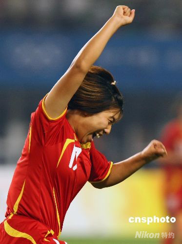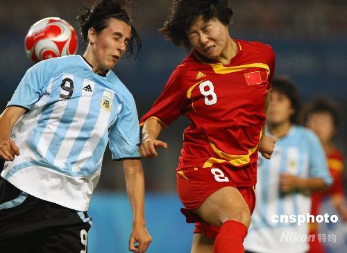 8月12日,北京奧運會女足預賽,中國對阿根廷的比賽在秦皇島奧體中心舉行,中國女足以2:0戰(zhàn)勝阿根廷女足,以小組第一身份出線。中新社發(fā) 劉新 攝