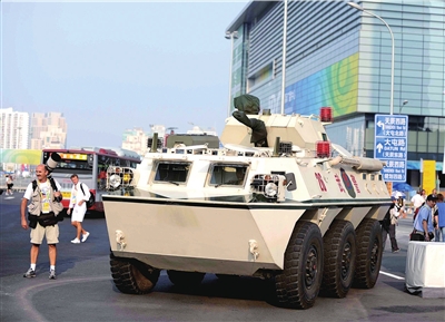 裝甲車停在奧運(yùn)主新聞中心安檢口。范繼文攝