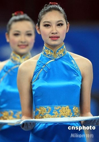 北京奧運(yùn)會(huì)體操比賽在奧林匹克公園內(nèi)的國(guó)家體育館舉行,許多觀眾與記者認(rèn)為,這里的禮儀小姐最美。中新社發(fā) 任晨鳴 攝