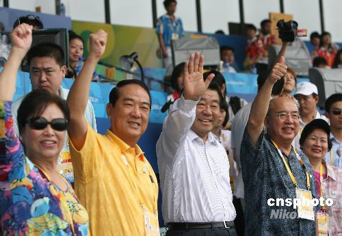 8月13日,北京奧運(yùn)會棒球比賽揭幕戰(zhàn)在中華臺北隊和荷蘭隊之間舉行,中共中央政治局常委、全國政協(xié)主席賈慶林與中國國民黨主席吳伯雄、親民黨主席宋楚瑜到現(xiàn)場觀戰(zhàn),共同為中華臺北棒球隊加油。中新社發(fā) 武仲林 攝