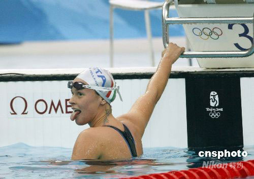 8月13日,在北京奧運(yùn)會女子200米自由泳決賽中,意大利選手費(fèi)代麗卡·佩萊格里尼以1分54秒82的成績獲得金牌,并打破世界紀(jì)錄。圖為她在泳池以吐舌獨(dú)特的方式慶祝勝利。中新社發(fā) 杜洋 攝