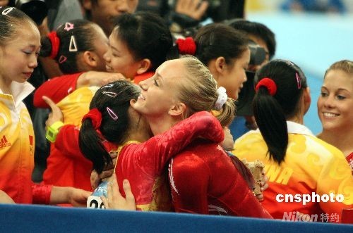 美國隊祝賀中國女子體操隊奧運奪冠。中新社發(fā) 任晨鳴 攝